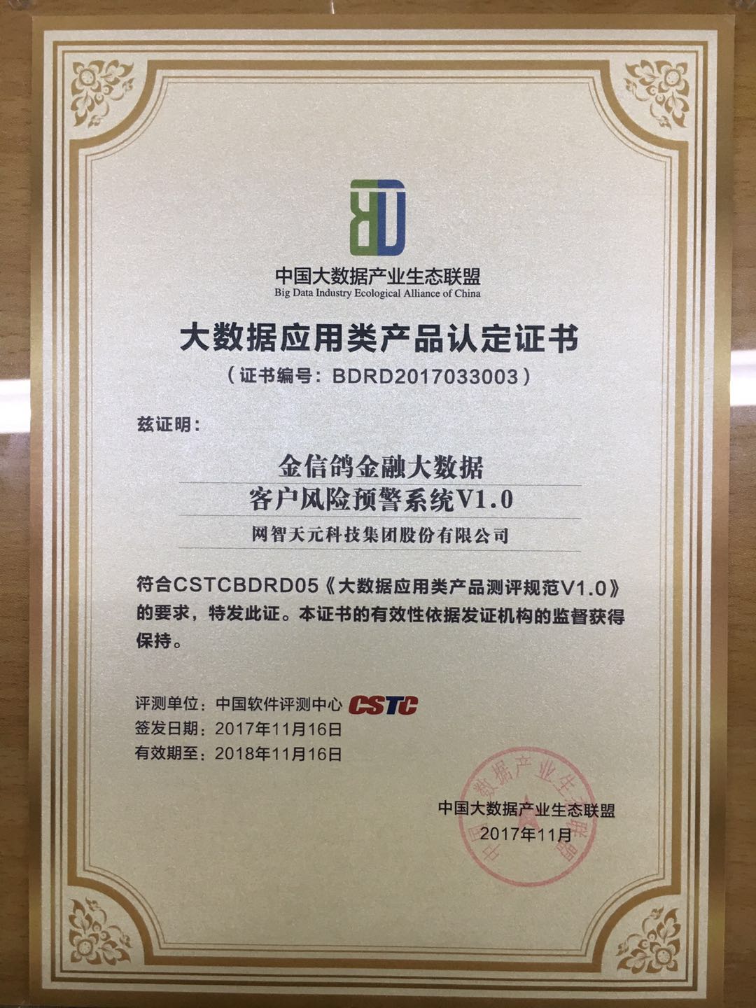网智天元旗下产品“金信鸽金融大数据客户风险预警系统V1.0” 凭借过硬的技术实力,获得“优秀大数据产品”认证。“金信鸽金融大数据客户风险预警系统V1.0”是网智天元基于互联网大数据技术开展的创新风控,以大数据思维完善风险管理,帮助客户树立“用数据防风险”的新型风险管理理念。该系统广泛采取多维度信息及用户行为分析交叉对比,其中,自动化分析体系,可实现基于分析模型的自动化结果展现,云技术数据处理中心提供强大数据支撑,帮助客户提升风险识别和计量水平,在金融风控领域具有绝对优势。