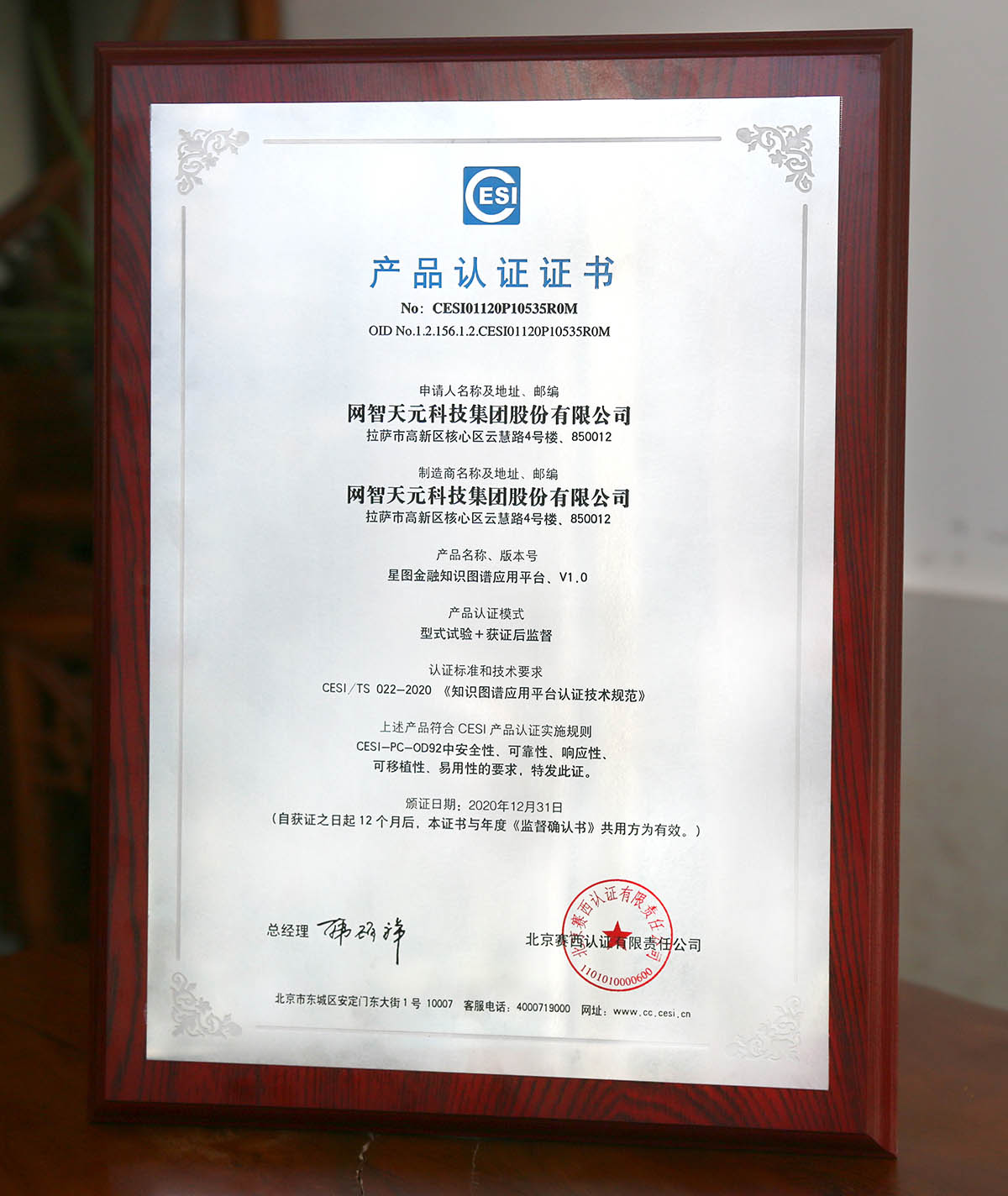 ▲图|星图知识图谱平台(V1.0)产品认证证书