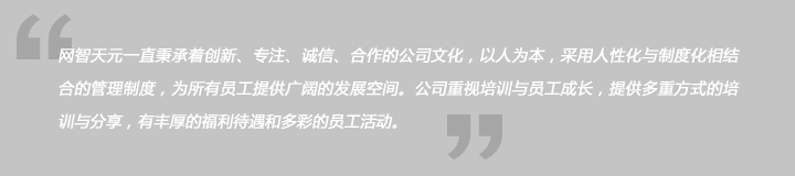 北京网智天元科技股份有限公司一直秉承"创新、专注、诚信、合作"的经营理念,以"汇聚互联网智能,创造大数据价值"为目标,致力于研制新一代的互联网智能技术及大数据分析解决方案,凭借领先的技术、一流的产品、全面的方案、优质的服务和卓著的信誉,在大数据采集集成、舆情管理导控、大数据挖掘分析、大数据整合营销等发展潜力巨大的领域中处于领先的地位,成为最优秀的互联网大数据智能软件与服务供应商!