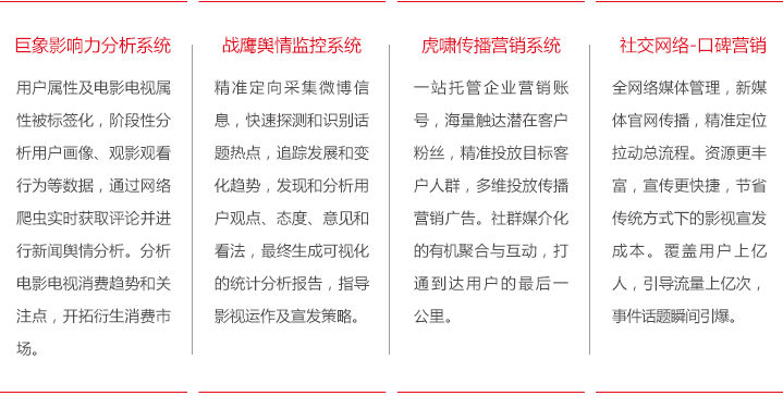 大数据时代,数据成为影视内容生产的新思维和新资源,数据分析成为影视创新传播和营销模式的新线索,网 智天元影视大数据通过不同人群定位、海量数据分析、媒介聚合互动、互联网热度追踪与监测,实现影视营销 整合评估及策略规划。